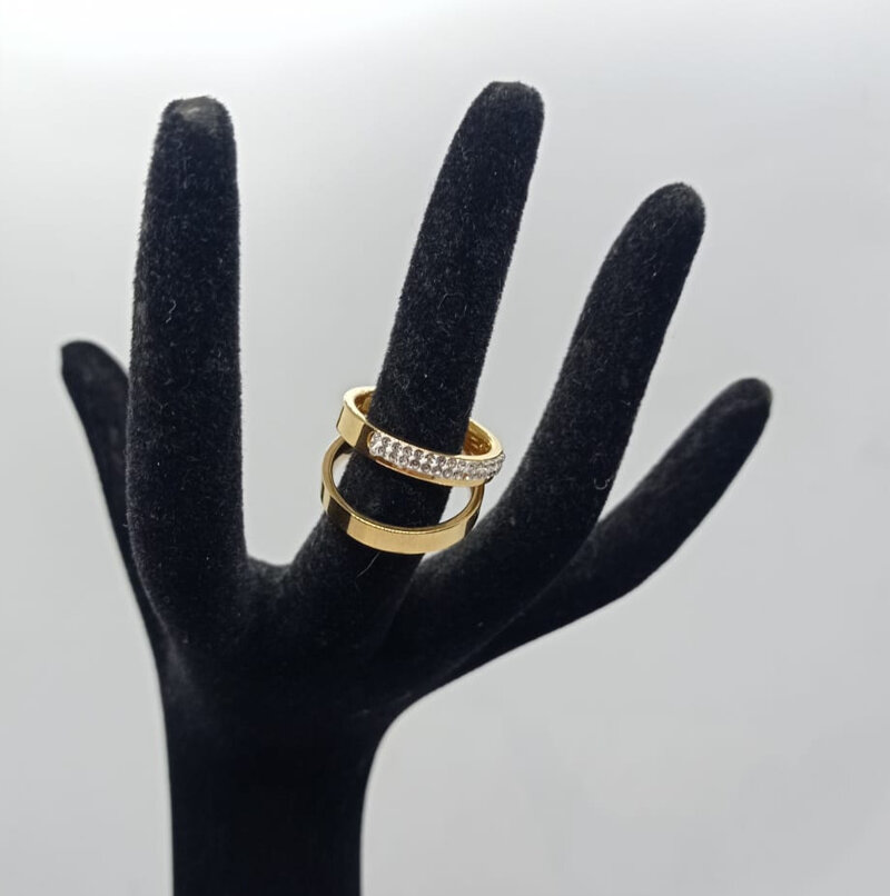 Anello doppio in acciaio: uno lucido dorato, il secondo lucido dorato con sezione di strass taglia 18 non apribile