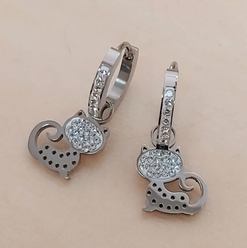 Orecchini in acciaio a forma di gatto, con brillantini per bambina