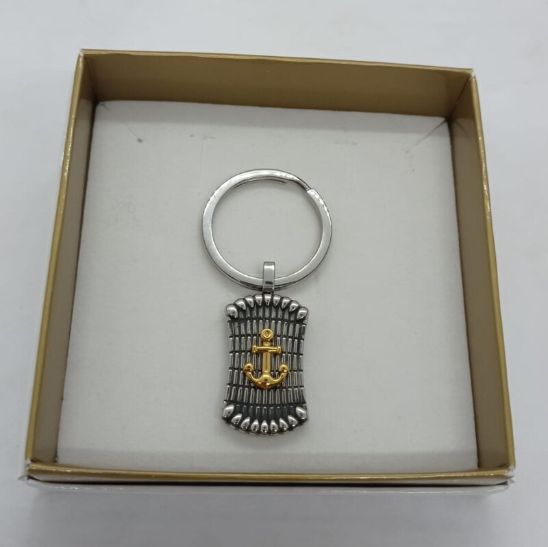 Portachiavi con ancora dorata su targhetta in acciaio