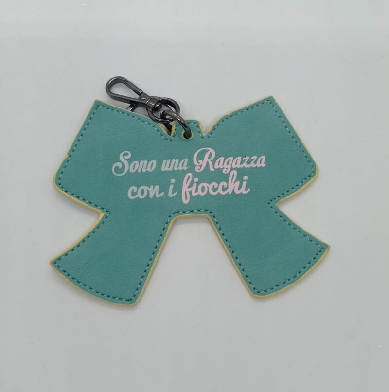 Portachiavi Le Pandorine, Fiocco turchese con frase carina e gancio in acciaio