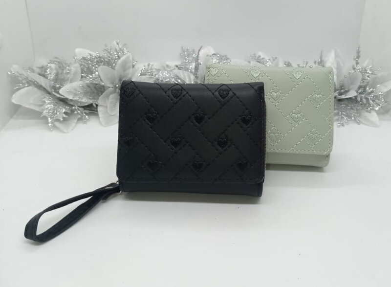 Portafogli in ecopelle con cuori e doppia tasca nero e verde pistacchio, con laccetto