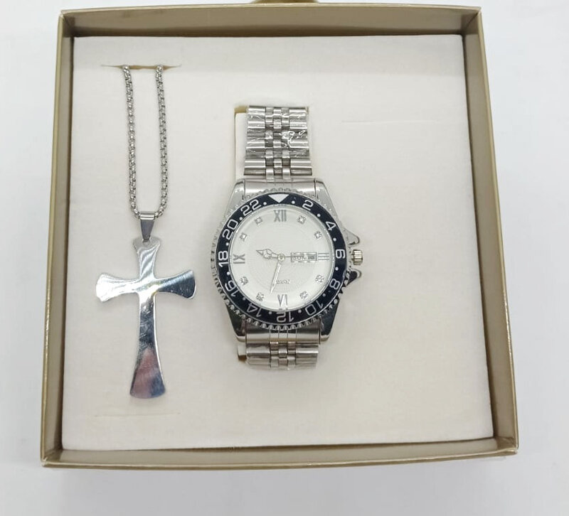 Set di collana a forma di croce in acciaio con orologio in quarzo e acciaio da uomo